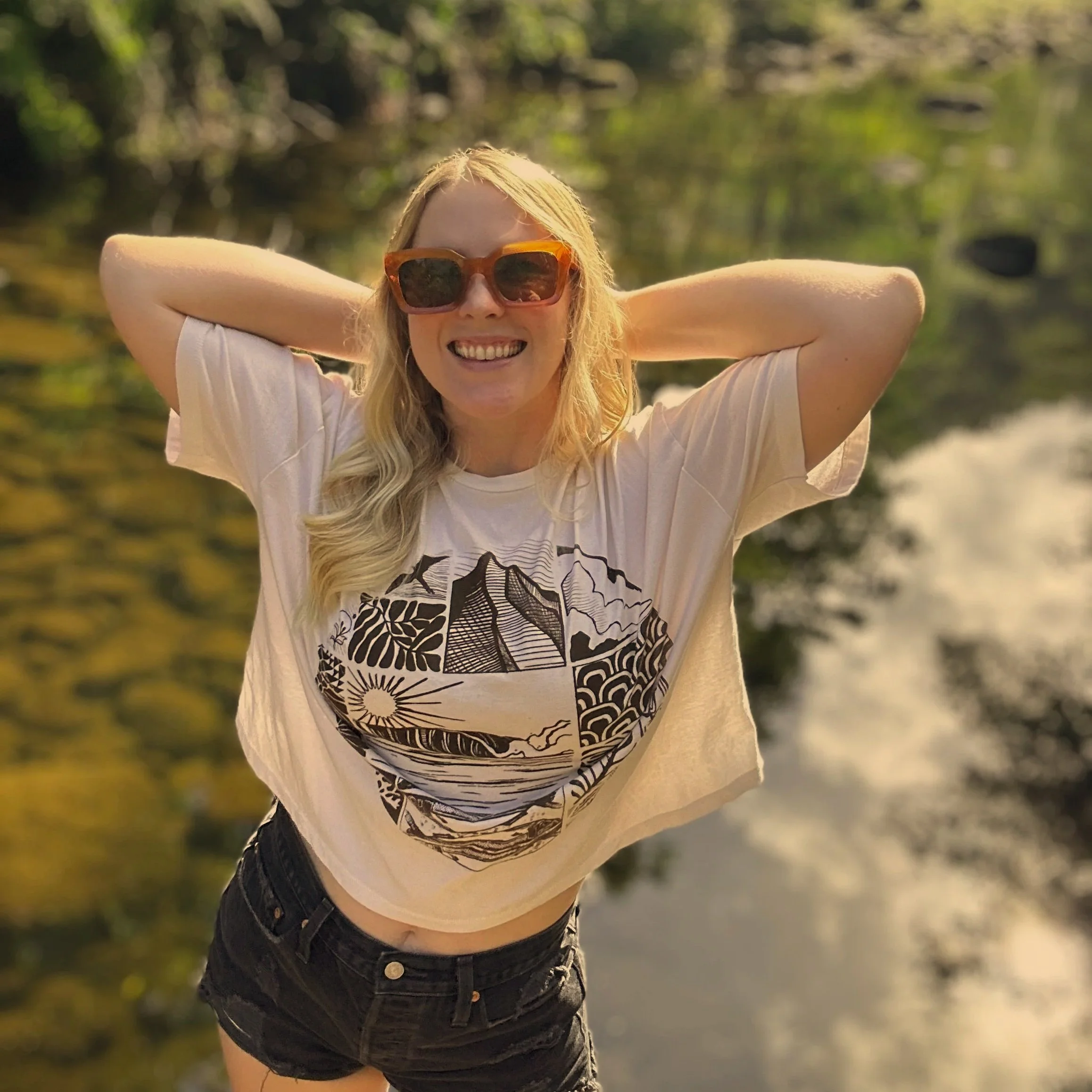 The Classic Beach Creature Crop Top. Beautiful beach scene printed on soft 100% organic cotton. Hand made in Hilo with eco-friendly materials. Beach Creature created and cured from start to finish. Perfect for those sunny Hilo days.